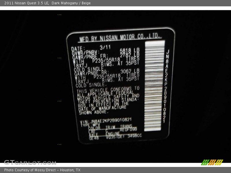 Dark Mahogany / Beige 2011 Nissan Quest 3.5 LE Photo #13