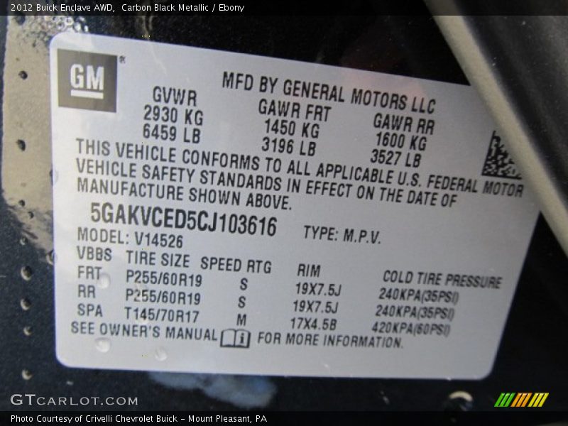 Info Tag of 2012 Enclave AWD Photo #33